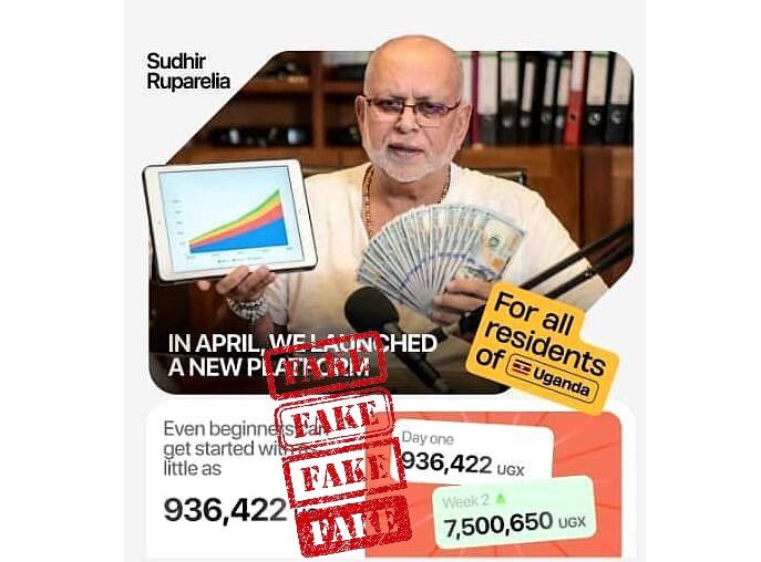 The advert, circulating under a page branded “Uganda 24/7,” claims that a newly launched platform can multiply a user’s money at extraordinary speed, suggesting that a starting investment of Shs936,422 can yield over Shs7.5 million in a matter of weeks. It features Ruparelia holding cash beside a tablet displaying rising charts, giving the false impression that he endorses or is involved in the scheme.
